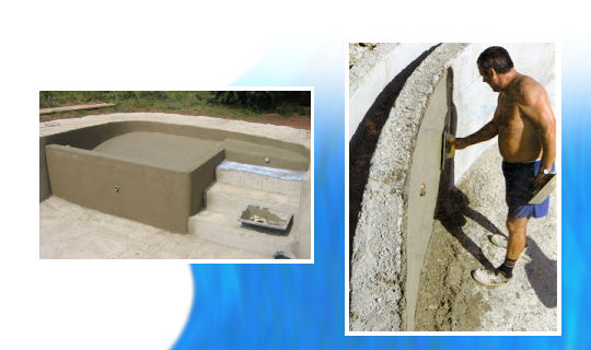 Application de l'enduit étanche, mortier dosé à 500kg hydrofugé avec sikalatex. L'enduit est appliqué sur les murs, le fond et les escaliers pour rendre la piscine complètement étanche.